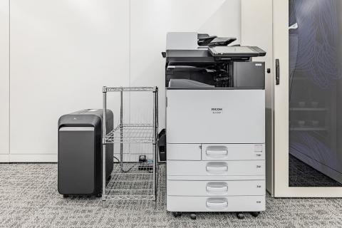 充実のインフラ: 専用ポスト、カラーコピー機、シュレッダー、ミニキッチン(電子レンジ付)、喫煙スペース完備。